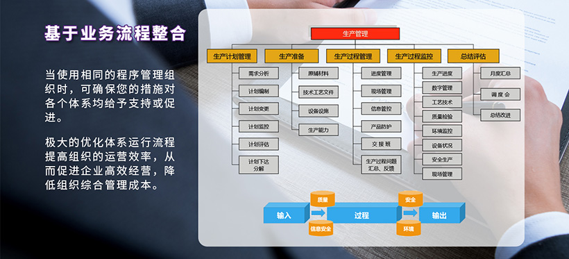 將組織多個不同的體系和過程中的多要素整合成一個完整的框架的管理體系,并能夠使組織滿足多個管理體系標準的要求