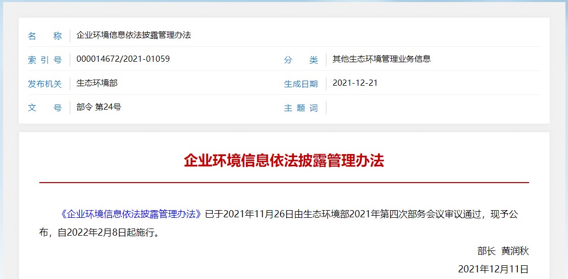 值得注意的是,《管理辦法》第二十一條提出生態環境部、設區的市級以上地方生態環境主管部門應當依托政府網站等設立企業環境信息依法披露系統,集中公布企業環境信息依法披露內容,供社會公眾免費查詢,不得向企業收取任何費用。