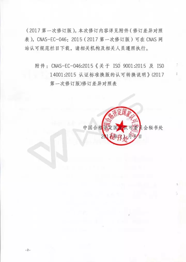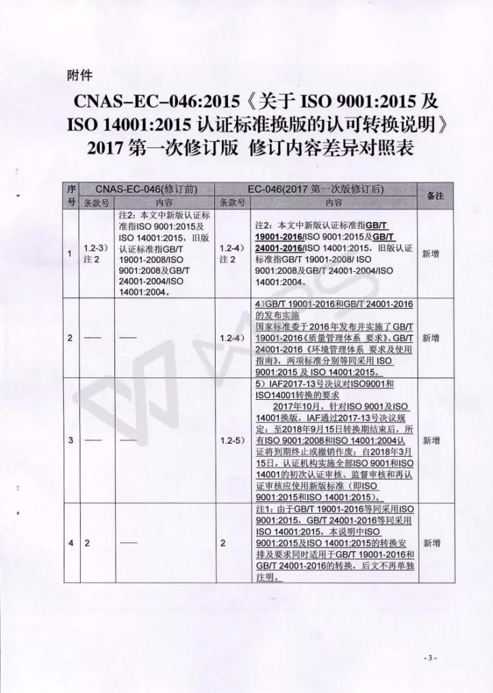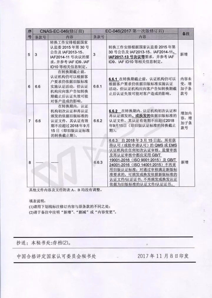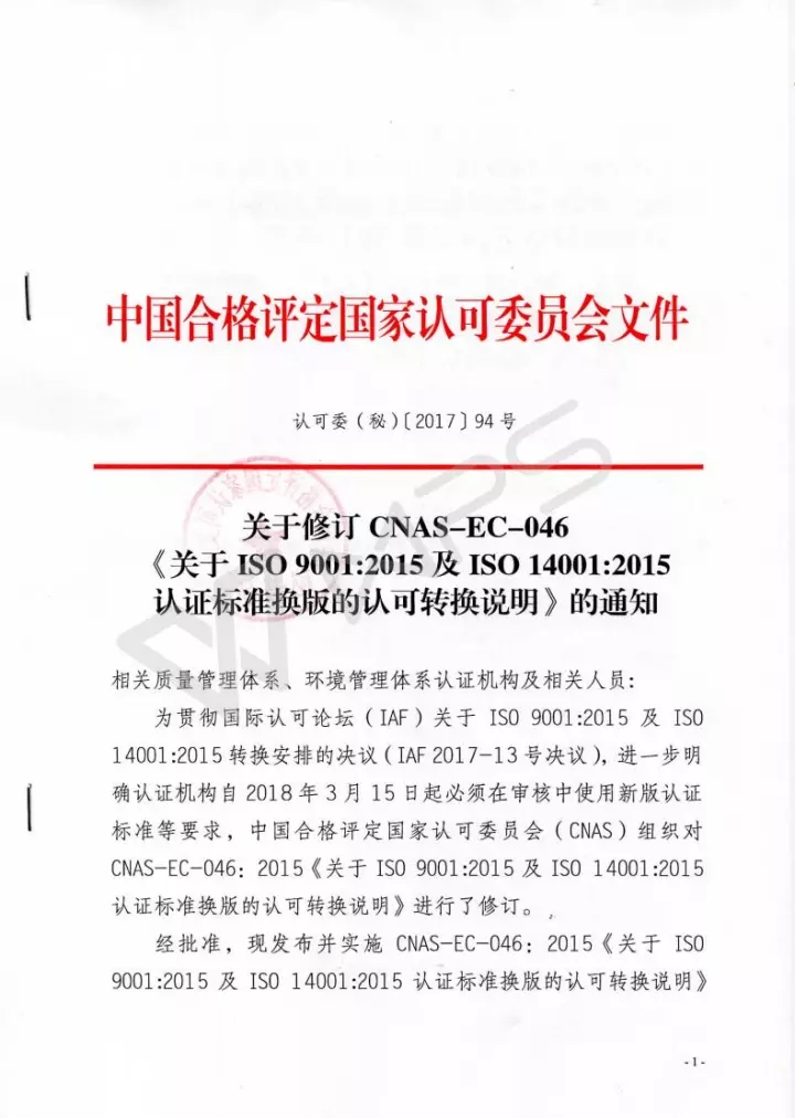 各認證組織: 接認可委通知:自2018年3月15日起,認證機構必須在審核中使用新版認證標準(ISO 9001:2015和ISO14001:2015)。即:所有的初次認證審核、監督審核和再認證審核自2018年3月15日起均應使用新版標準。 認證依據為舊版標準(即ISO 9001:2008和ISO14001:2004)的認證證書,有效期截止至2018年9月15日。請各組織關注轉版審核工作應盡量在2018年6月30日以前完成,最晚不宜超過2018年8月15日!未實施新版標準轉換審核的客戶盡快與世通公司聯系。 世通認證主要業務領域: ISO9001質量管理體系認證 ISO14001環境管理體系認證 OHSAS18001職業健康安全管理體系認證 GB/T50430工程建設施工質量管理體系認證 GB/T22000食品安全管理體系認證 HACCP食品危害分析與關鍵控制點體系認證 詳請內容見如下附件: