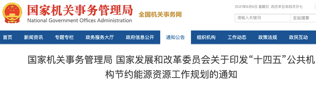 6月1日國管局、發改委聯合印發《“十四五”公共機構節約能源資源工作規劃的通知》。全國約158.6萬家公共機構要進行綠色低碳化改造。
