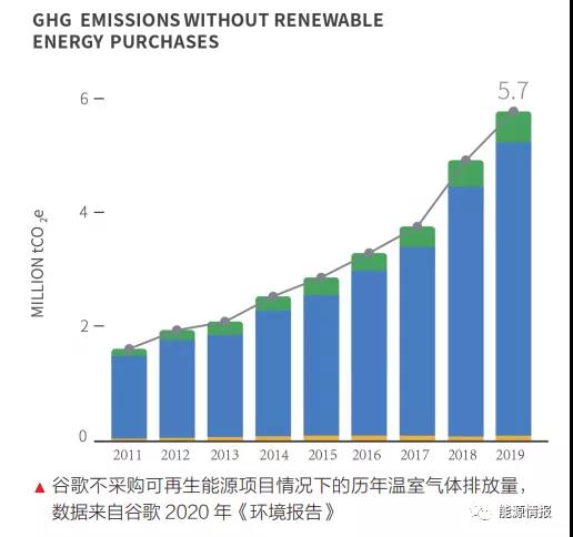 這其中,實(shí)現(xiàn)絕對減排的目標(biāo)很值得關(guān)注。一般科技型企業(yè)由于業(yè)務(wù)處于持續(xù)上漲期,即使可以實(shí)現(xiàn)碳中和,其實(shí)際碳排放量也多會持續(xù)上漲。以谷歌為例,盡管谷歌宣稱自2007年起就已通過減少總能源消耗、采購可再生能源相關(guān)項(xiàng)目、碳抵消等途徑實(shí)現(xiàn)了碳中和,但從下圖數(shù)據(jù)不難看出,假如不進(jìn)行可再生能源項(xiàng)目的采購,谷歌自身業(yè)務(wù)發(fā)展軌跡所對應(yīng)的溫室氣體排放絕對值仍在逐年增加。因此,以谷歌為代表的科技型企業(yè)通常不會提出絕對減排目標(biāo)。