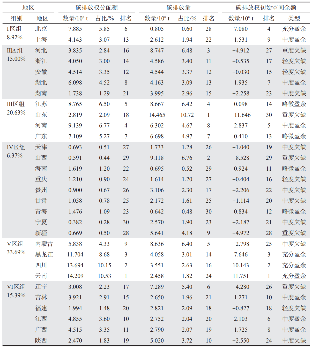 表1 2017年我國30個省級行政區碳排放量、碳排放權分配額及其初始余額