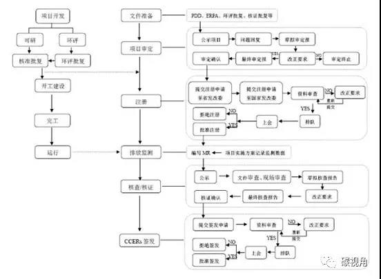 CCER項目的開發流程在很大程度上沿襲了清潔發展機制(CDM)項目的框架和思路,主要包括6個步驟,依次是:項目文件設計、項目審定、項目備案、項目實施與監測、減排量核查與核證、減排量簽發。