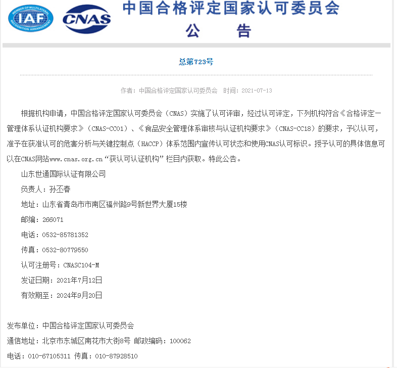 2021年7月12日,山東世通國際認(rèn)證有限公司正式取得中國合格評定國家認(rèn)可委員會(huì)(CNAS)危害分析與關(guān)鍵控制點(diǎn)(HACCP)體系認(rèn)可證書,可以在獲準(zhǔn)認(rèn)可的HACCP體系范圍內(nèi)宣傳認(rèn)可狀態(tài)和使用CNAS認(rèn)可標(biāo)識(shí)。