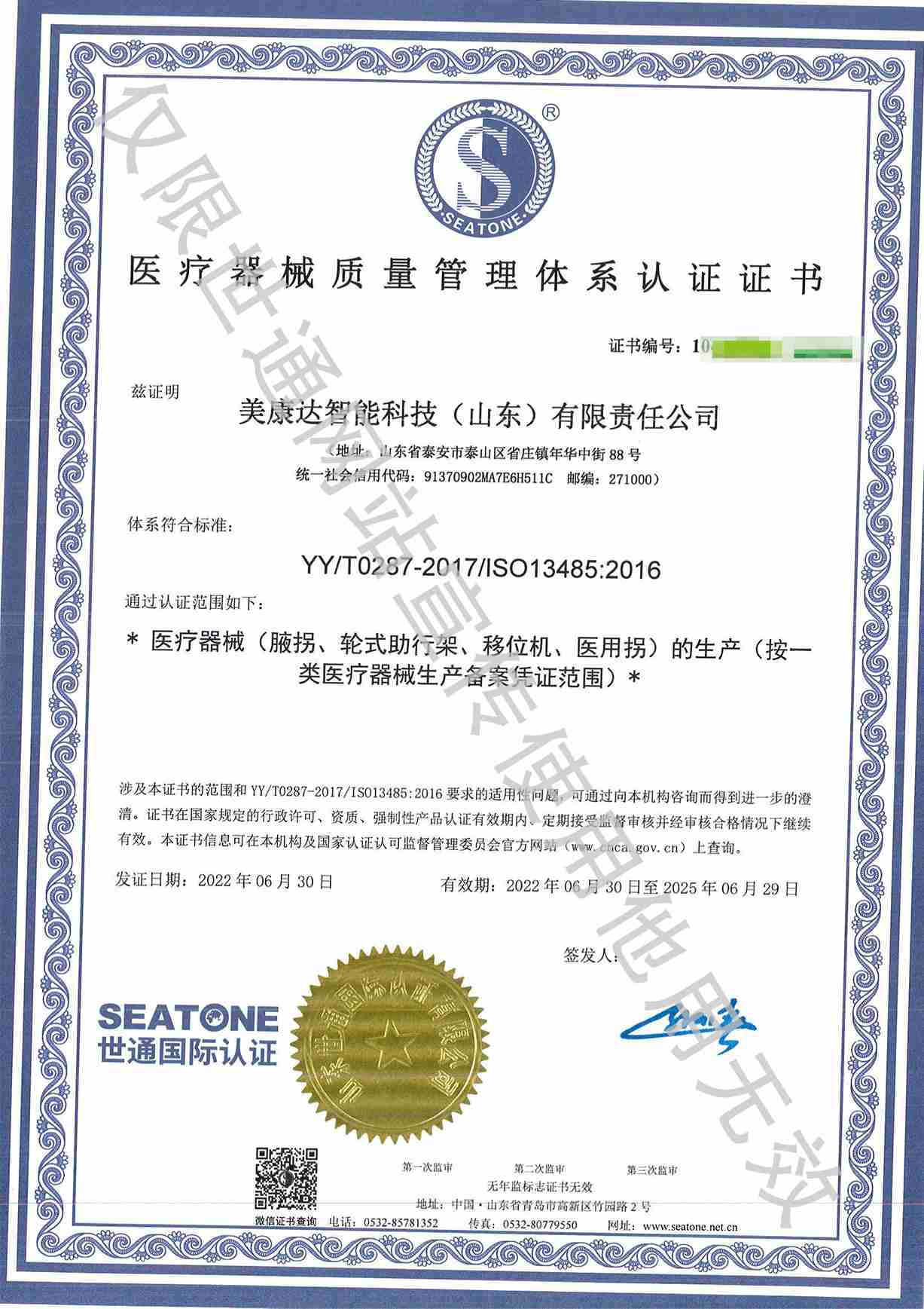 世通認證協助美康達智能科技(山東)有限責任公司成功獲得ISO13485醫療器械質量管理體系認證證書 。