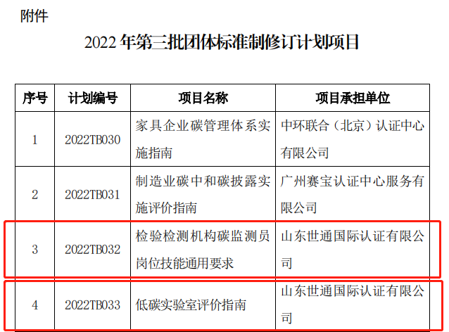 此次第三批團體標準制修訂計劃項目公布的15項團體標準項目中,有兩項標準《低碳實驗室評價指南》和《檢驗檢測機構碳監測員崗位技能通用要求》的起草單位均為山東世通國際認證有限公司。