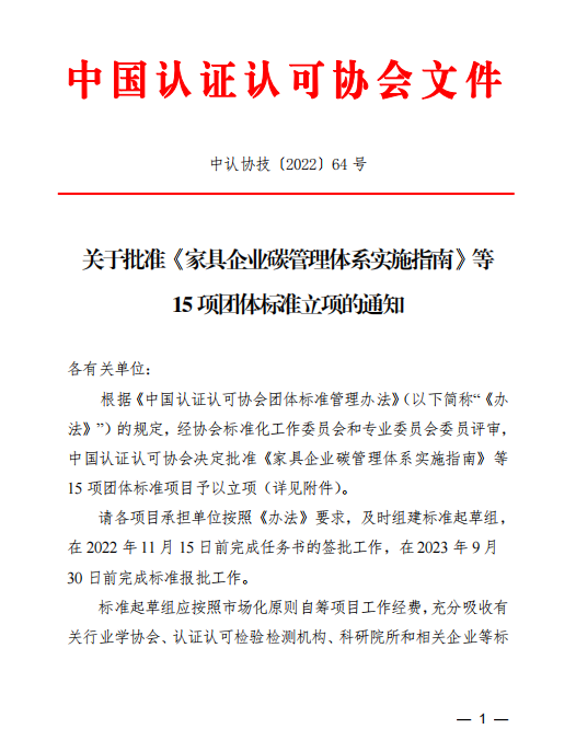 10月25日,中國認證認可協會發布了“關于批準《家具企業碳管理體系實施指南》等15項團體標準立項的通知”。通知指出:根據《中國認證認可協會團體標準管理辦法》的規定,經協會標準化工作委員會和專業委員會委員評審,中國認證認可協會決定批準《家具企業碳管理體系實施指南》等15項團體標準項目予以立項。