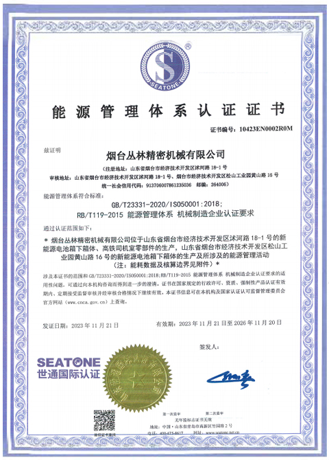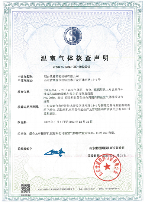 2023年11月21日,山東世通國際認證有限公司為煙臺叢林精密機械有限公司頒發能源管理體系認證、溫室氣體核查聲明、產品碳足跡認證證書。助力企業綠色可持續發展,提升企業形象。