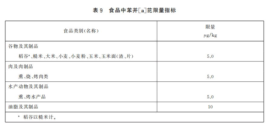 國標GB 2762-2017《食品安全國家標準 食品中污染物限量》對各類食品中的苯并(a)芘含量做了嚴格規定如下:
