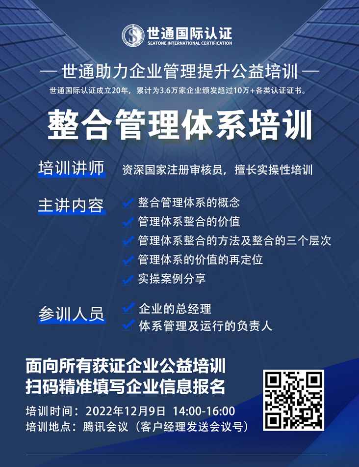 下一篇:【公益培訓(xùn)】世通助力企業(yè)管理提升—《監(jiān)督、再認(rèn)證企業(yè)審核前指導(dǎo)》12月公益課堂