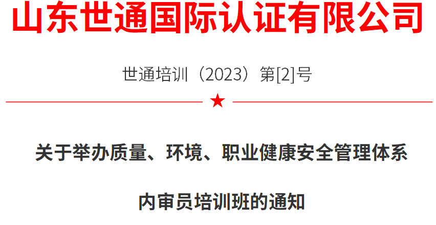 ISO9001:2015、ISO14001:2015、ISO45001:2018標準已發布實施多年,您在體系運行中是否遇到了難點、痛點和困惑?為了更好的幫助您加深對三體系標準的理解和應用,幫助貴司持續有效推動和提高企業管理水平、提升貴司綜合競爭力、促進貴司更好的生存和發展,世通認證擬于 2023 年8月在青島市高新區舉辦“質量、環境、職業健康安全管理體系內審員培訓班”。